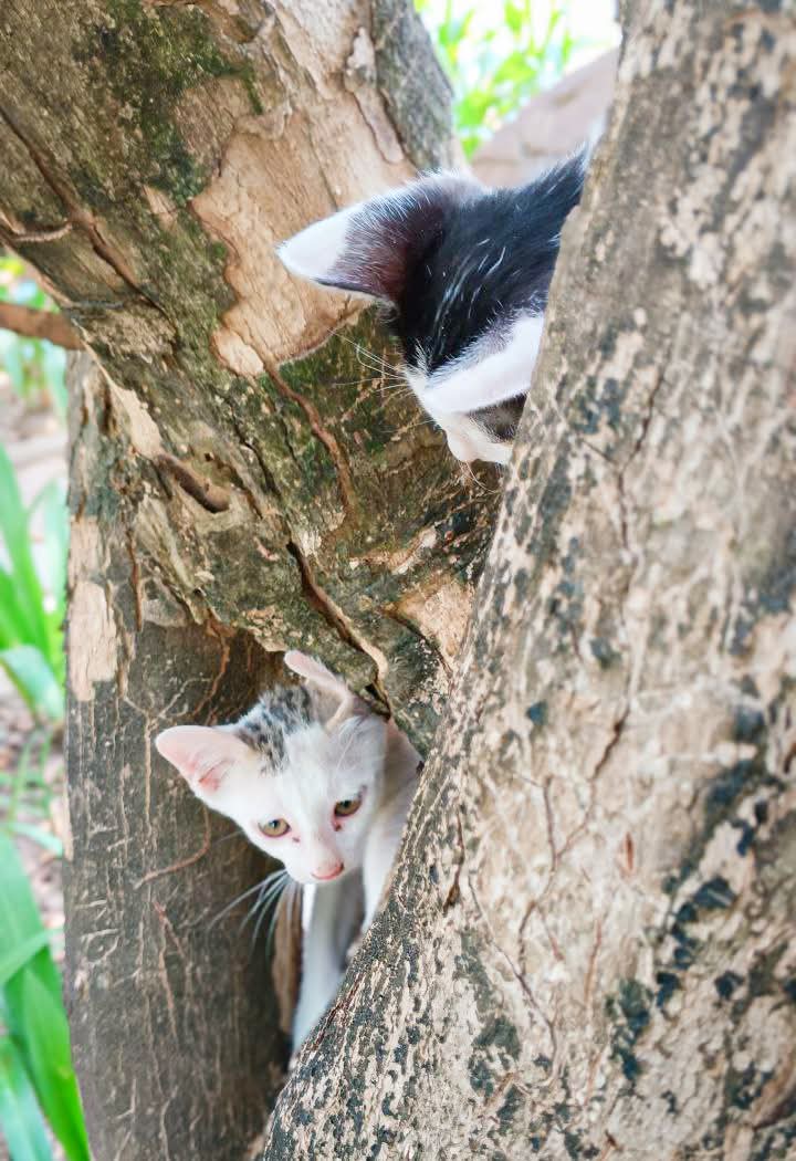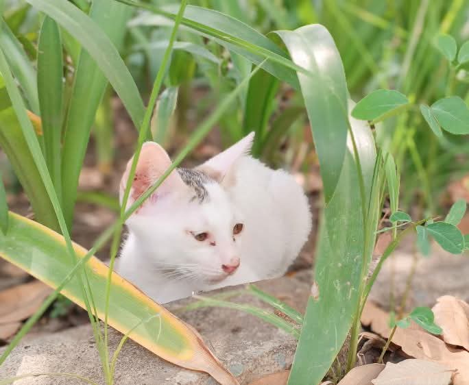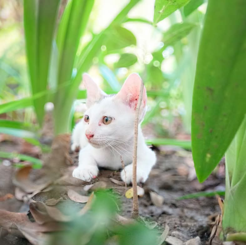 This sweet and curious white kitten loves to explore and climb trees. 🐱🌿